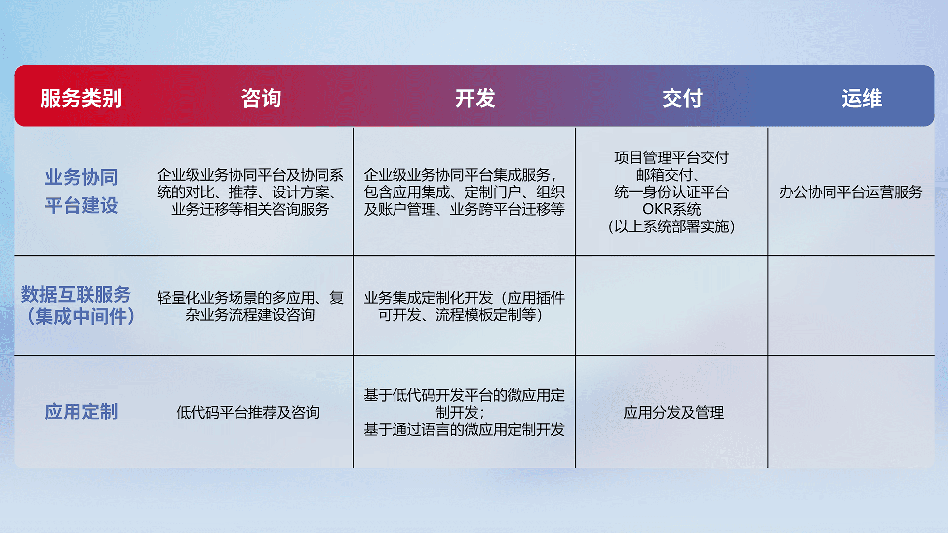 针对钉钉、、、企微、、IDaas等平台级产品提供产品的规划、、、、方案、、、交付、、、、定制化开发等服务,,,实现如统一协同办公、、、、智能客户服务、、混合会议管理、、智能数据查询、、、等业务场景,,,实现数字化转型。。。