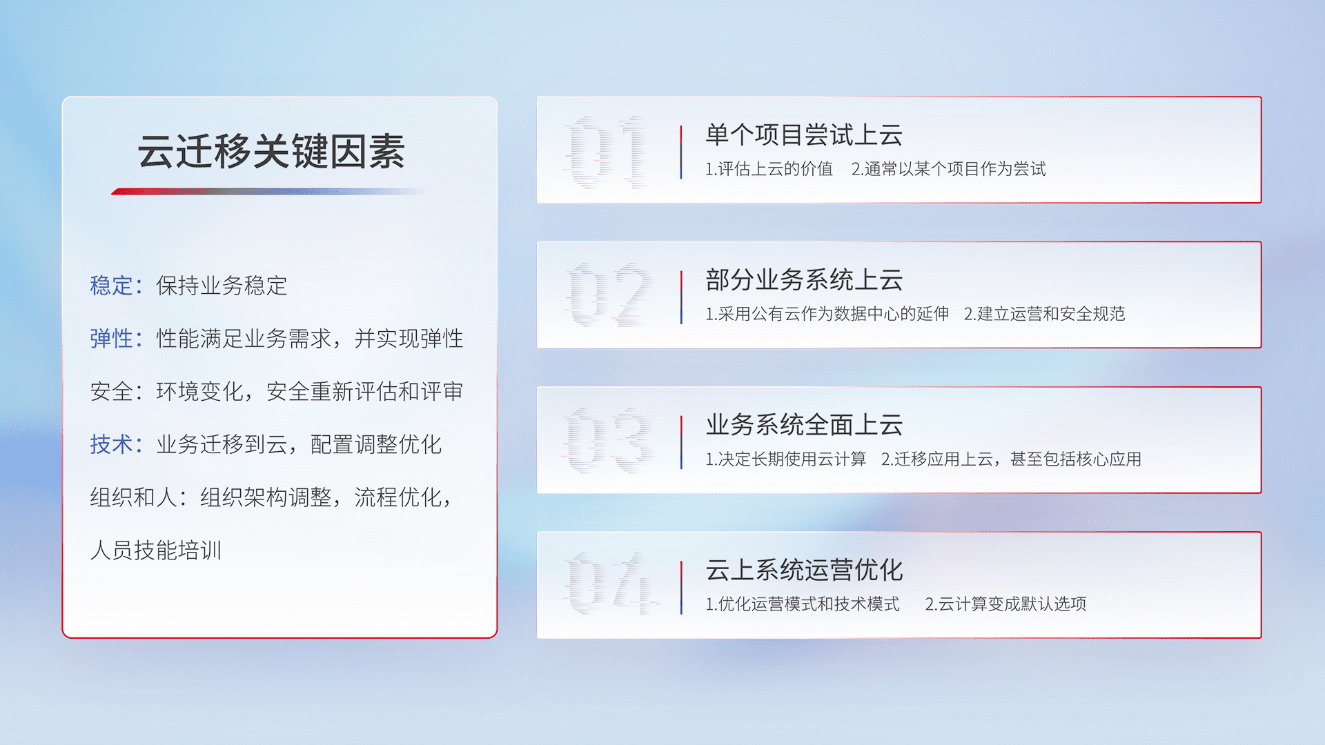 结合实际业务,,从规划设计、、、云平台选型、、、云原生改造、、数据迁移、、集成交付,,,迁移全过程为客户识别最佳上云路径,,做好风险识别管理,,,,设计网络架构、、、身份权限、、安全审计合规、、操作审计、、、日志审计、、、监控告警策略、、、、多站点容灾设计等,,,对云上基础设施进行整体规划,,提升IT治理水平,,以满足弹性、、高可用、、、、高性能的需求。。