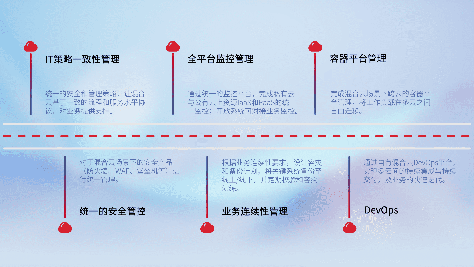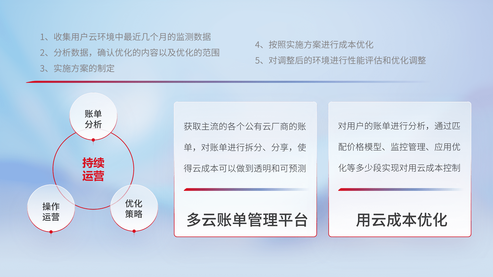 通过多云纳管,,,,以统一的资源数据模型把客户的云资源进行抽象和封装,,,进而实现对多云资源的统一操作,,,,保障云资源管理的可靠性、、稳定性与可用性。。。量身定制化运维内容,,配置、、、开发运维、、补丁管理、、备份、、监控、、认证和访问管理、、审计和日常巡检等,,保障在用云过程中的可靠度,,,稳定度以及高可用率。。