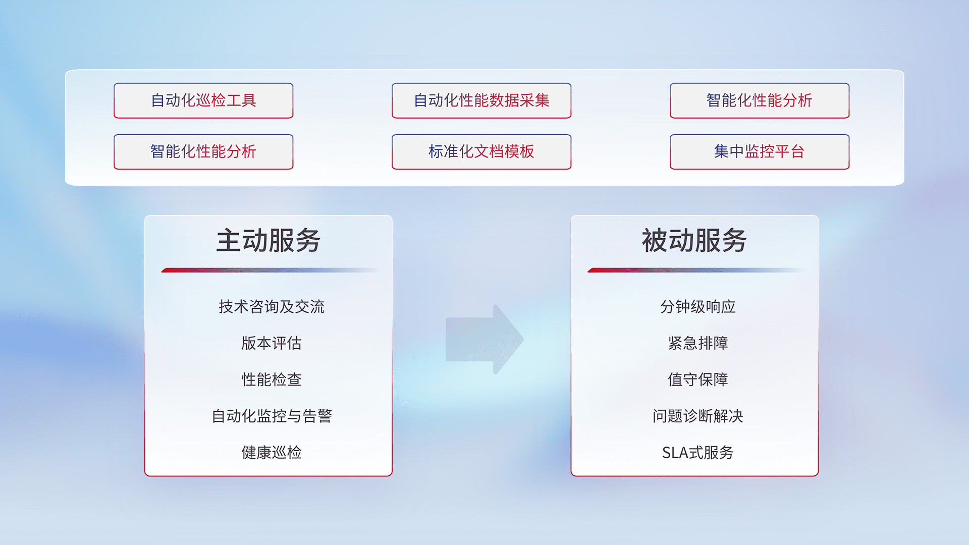 智能化工具和标准化文档,,,,保障服务质量,,提供主动服务(包含技术咨询、、、、版本评估、、、、性能检查、、、、自动化监控与告警、、健康巡检)和被动服务包含(分钟级响应、、、、紧急排障、、、值守保障、、、问题诊断解决、、SLA服务)。。。。